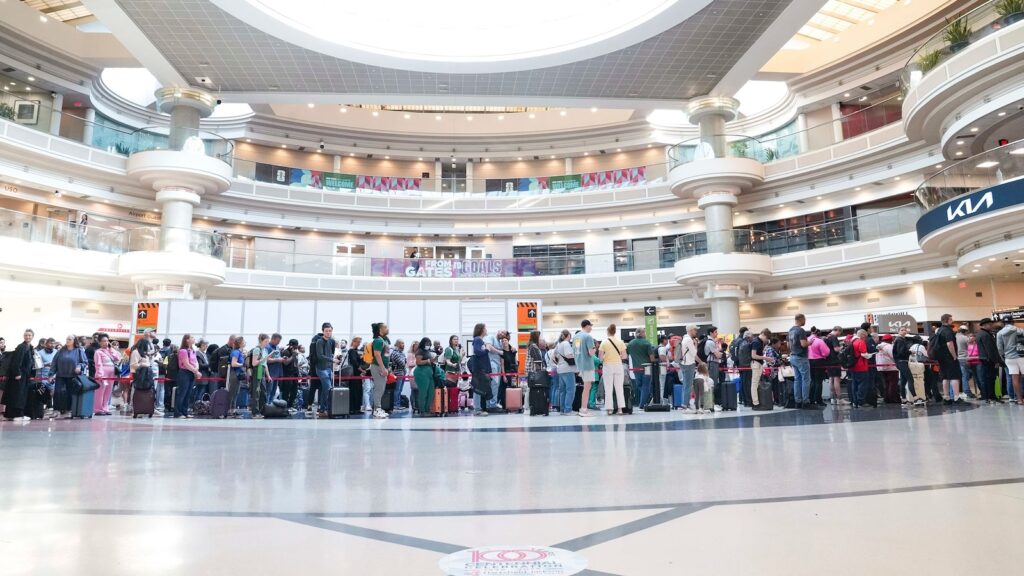 Vacationers stand in lengthy traces at Atlanta Hartsfield-Jackson Worldwide Airport, March 23, 2026, in Atlanta.