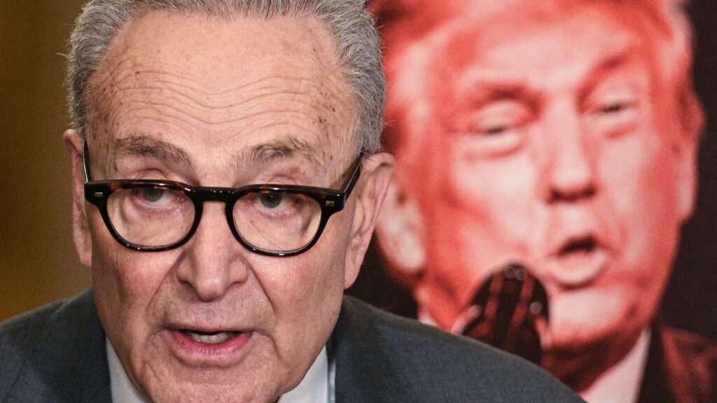 Senate Minority Chief Chuck Schumer stands subsequent to an indication that includes a picture of President Donald Trump as he speaks to the press following a closed-door lunch assembly with Senate Democrats on the US Capitol in Washington, March 3, 2026.