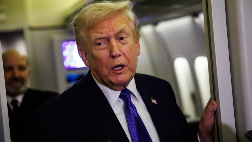 PHOTO: U.S. President Donald Trump speaks with members of the media on board Air Force One