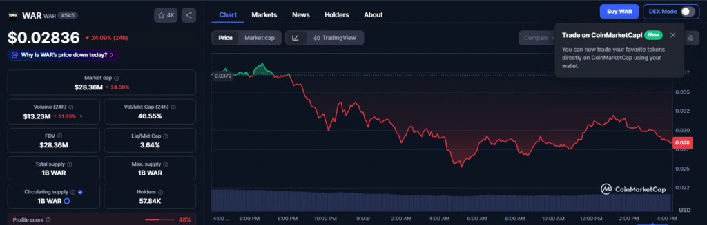 WAR token buying and selling at $0.028 at this time. Supply: CoinMarketCap